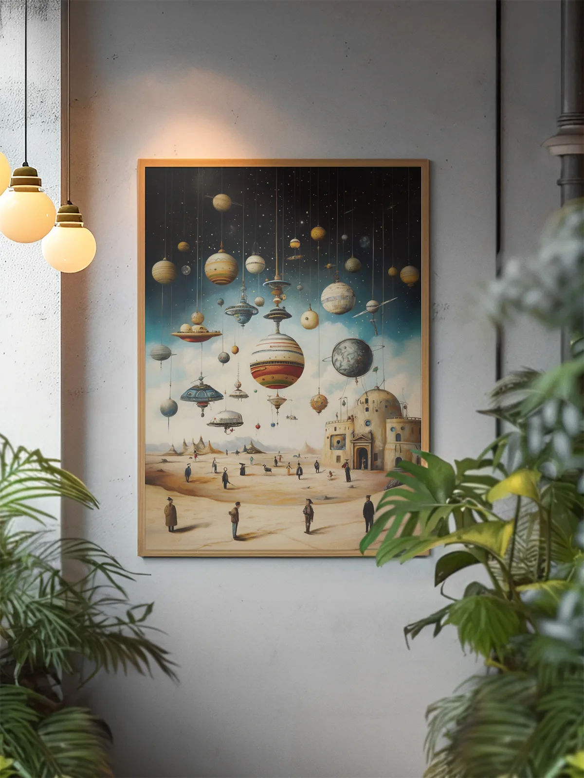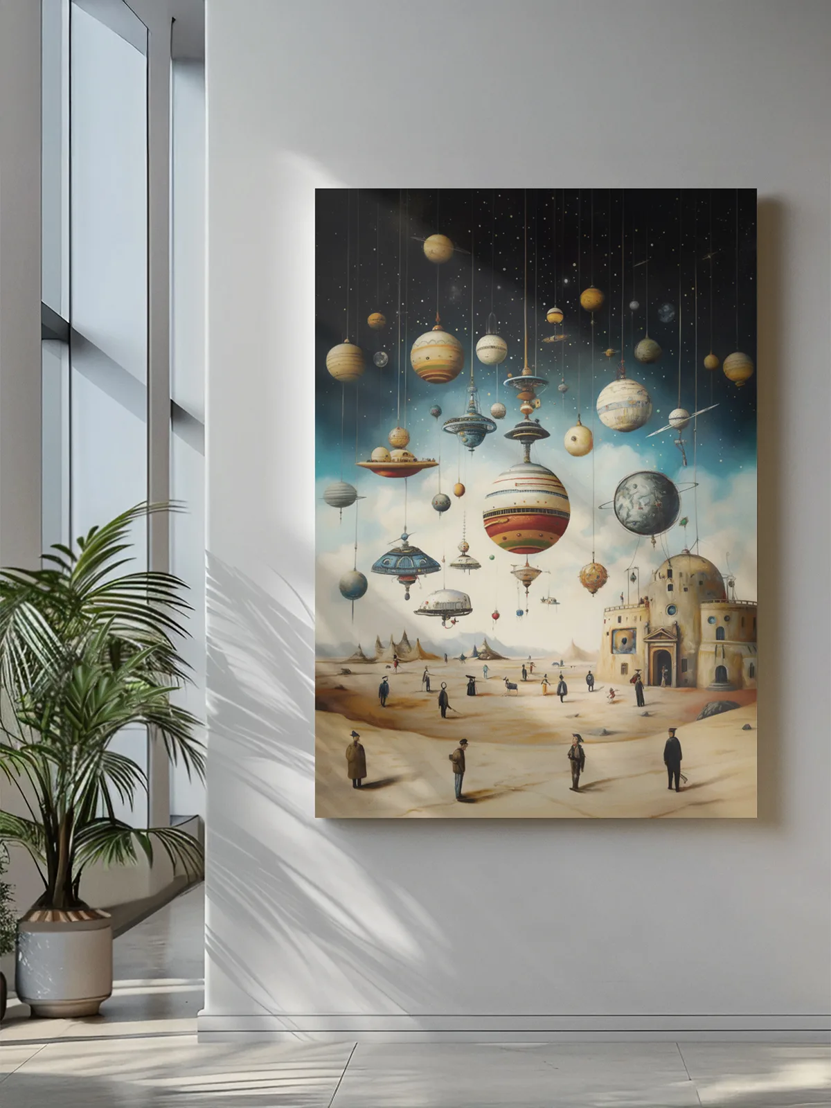 Surrealistyczna wizja świata, w którym planety i statki kosmiczne unoszą się jak lampiony nad pustynnym krajobrazem. Tajemnicze postacie spacerują pod gwiaździstym niebem, tworząc atmosferę marzycielskiej baśni.