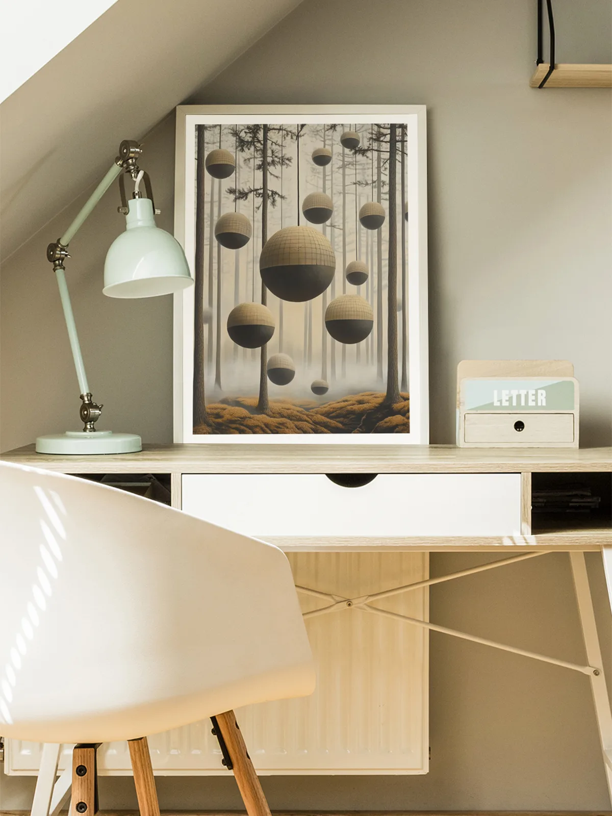 W mglistym lesie, gdzie smukłe drzewa sięgają nieba, unoszą się tajemnicze, kuliste obiekty o geometrycznej strukturze, kontrastujące swą ciemną i jasną kolorystyką z delikatną poświatą otoczenia. Czy chciałbyś to zobaczyć na własne oczy?