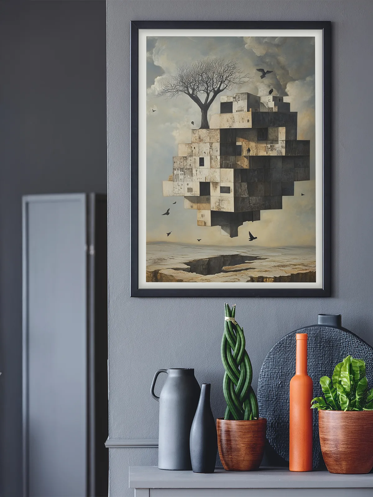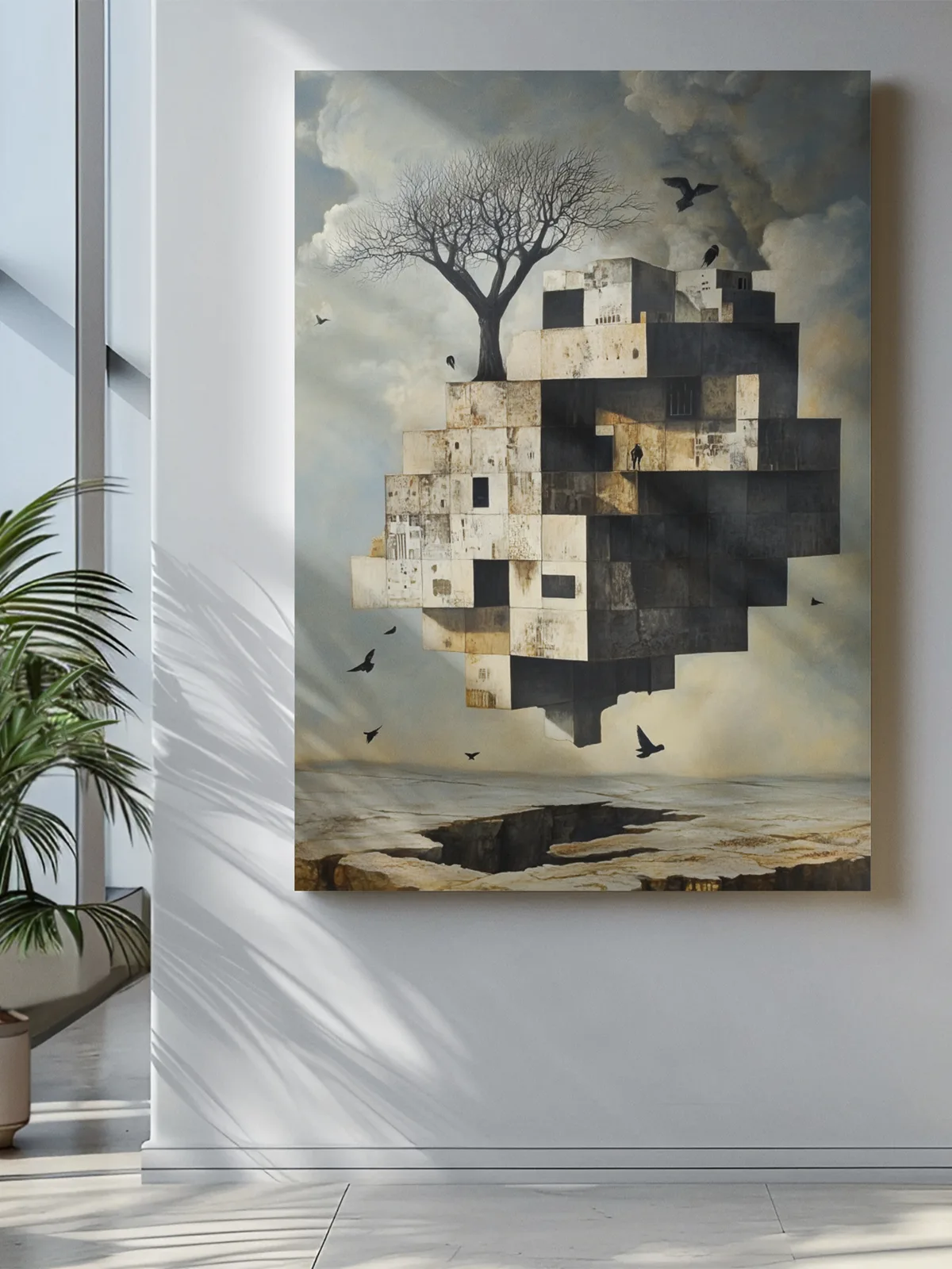 Monumentalna bryła, zbudowana z surowych, pociemniałych ścian, unosi samotne drzewo i zagubione postacie. Oderwana od ziemi. Albo od rzeczywistości.