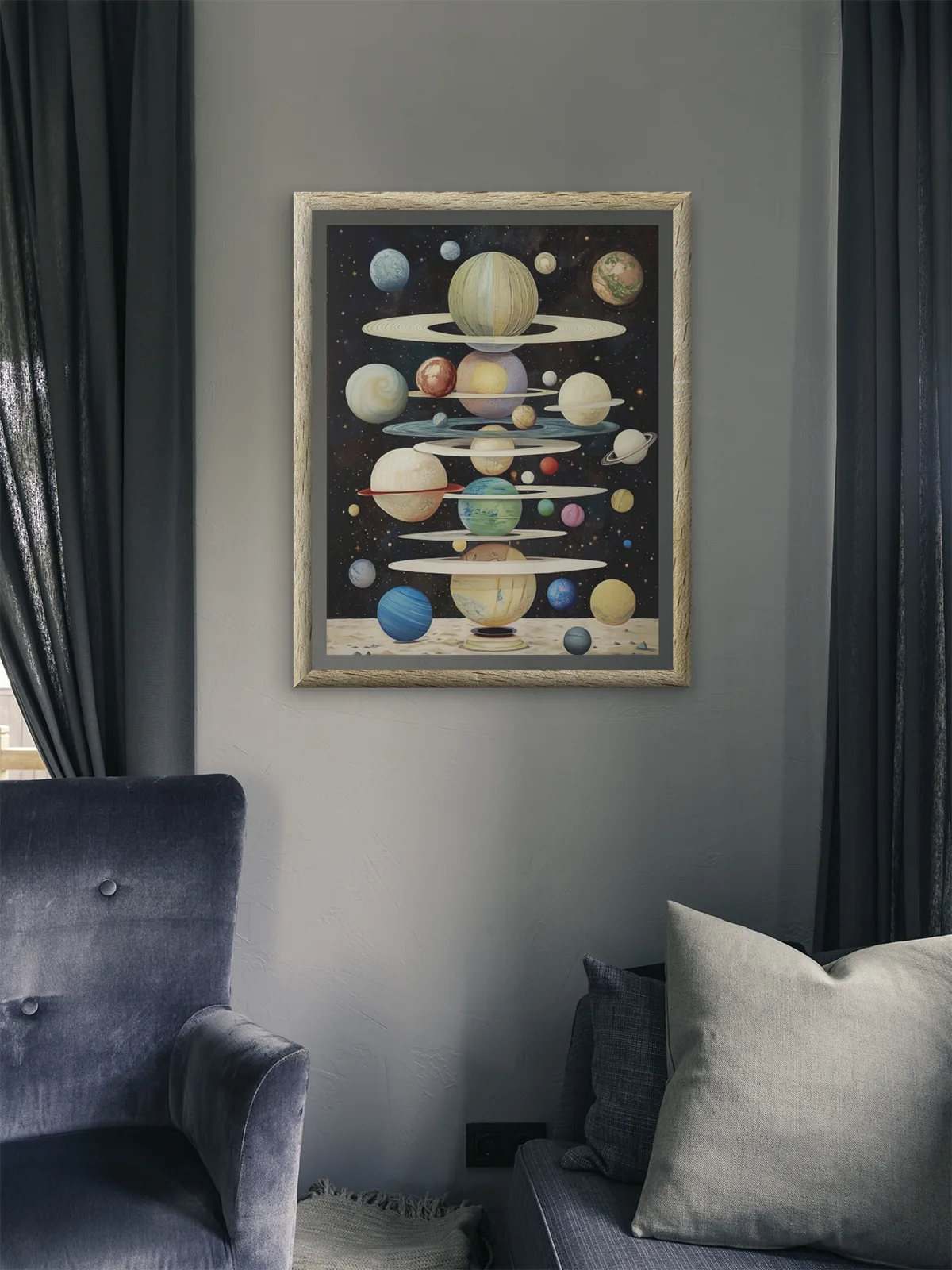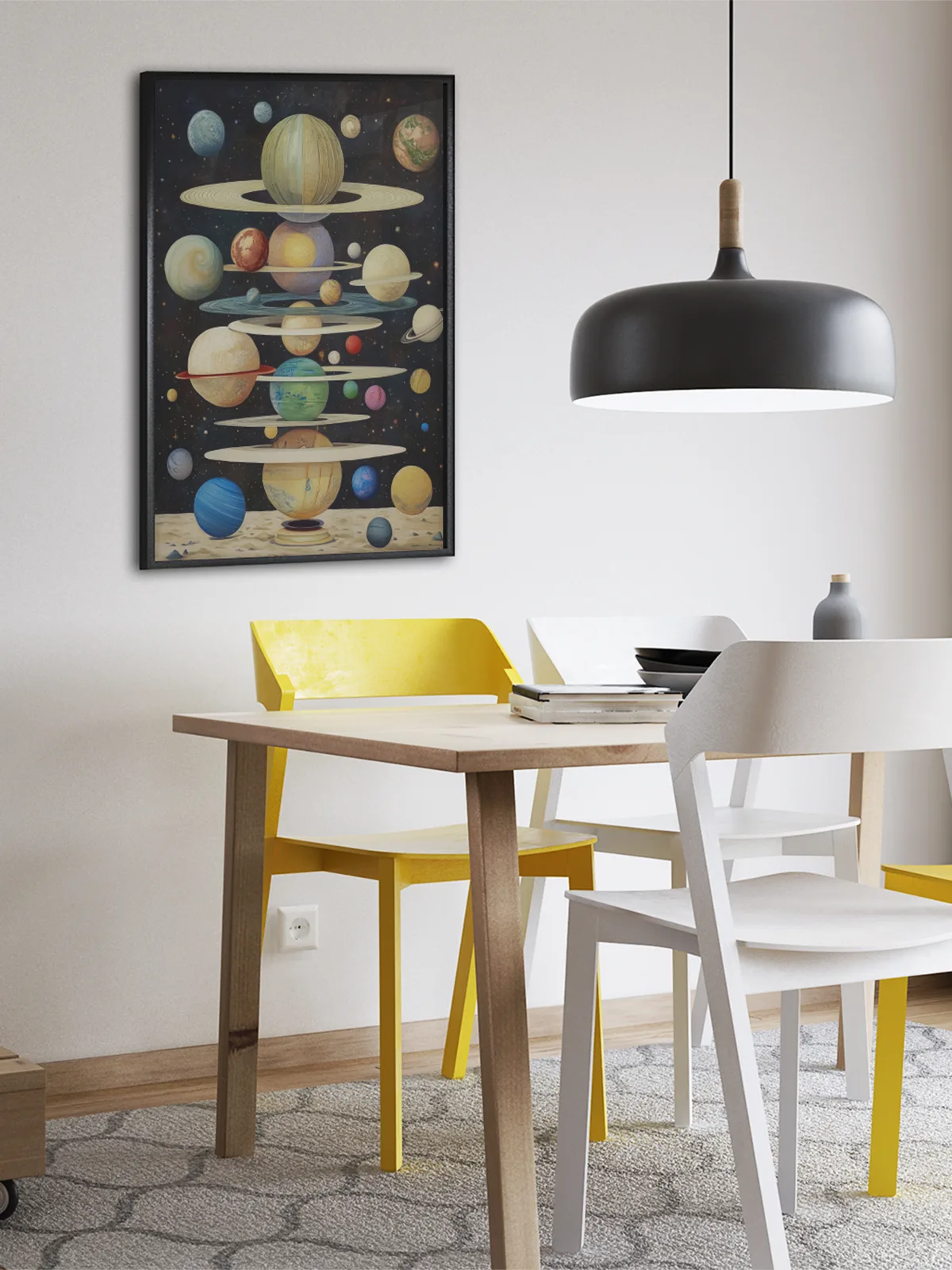 Planety ułożone w dziwny stos, jakby ktoś je poukładał w nocnym marzeniu. Pierścieniowe giganty, zielone klejnoty i błękitne kule. W czarnej przestrzeni migoczą gwiazdy. Ten obraz zaprasza na magiczną podróż w krainę… kontemplacji.