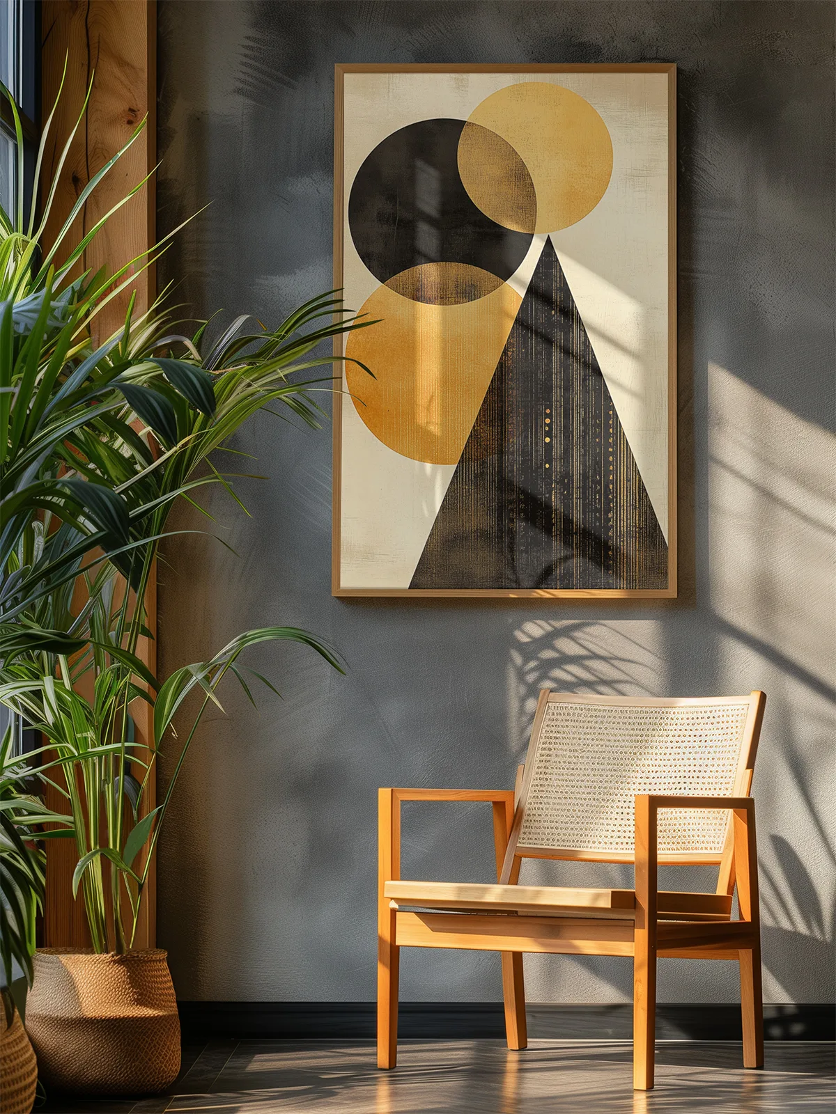 Abstrakcyjna kompozycja geometryczna w kolorach złota i czerni. Prezentuje harmonijną grę kształtów i tekstur. Piąty obraz z kolekcji.